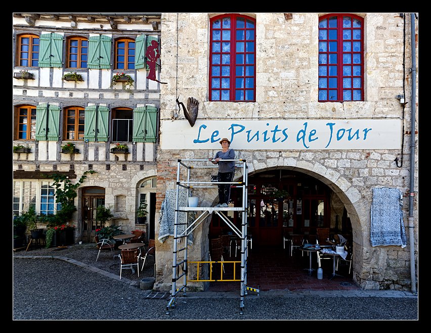 A l'occasion de ses 25 ans, "Le Puits de Jour", café musical, fait peau neuve avec son enseigne refaite par Claudine Quersin, peintre historique de cette façade emblématique de Lauzerte...